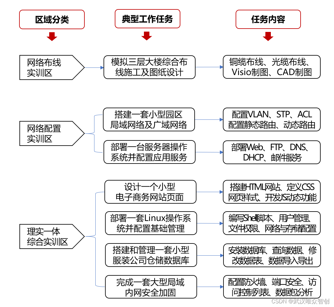 网络配置实训区:满足计算机网络专业数通产品安装调试的实验学习,通过对路由器、交换机、无线、防火墙设备的配置和对Linux服务器系统的管理,实现计算机网络系统的连接。