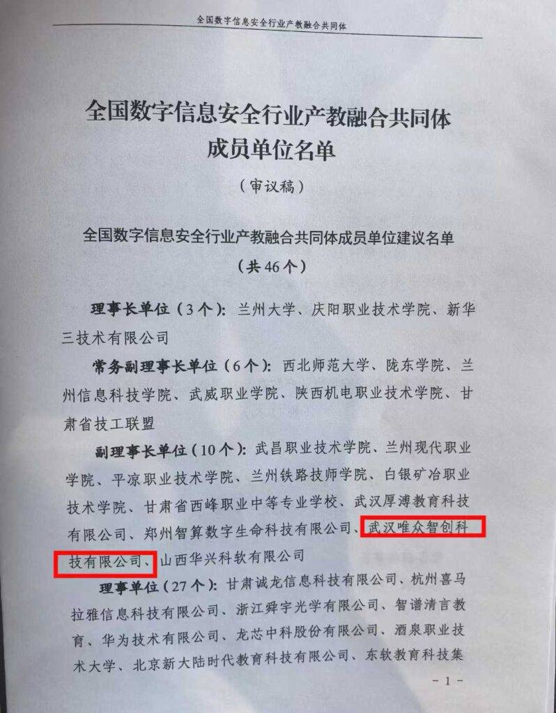 5月24日, 全国数字信息安全行业产教融合共同体(以下简称共同体)在 甘肃省 庆阳职业技术学院 正式成立! 武汉唯众智创科技有限公司作为受邀单位参加了成立大会。大会公布了共同体成员单位名单, 唯众成功当选副理事长单位 。 共同体 由兰州大学、庆阳职业技术学院、新华三技术有限公司、宁县和盛工业集中区、中飞航无人机制造(庆阳)有限公司共同发起,汇聚了行业内众多领军力量,旨在促进教育链和产业链有机融合,创新产教融合、校企合作体制机制,为行业培养高素质专业人才。