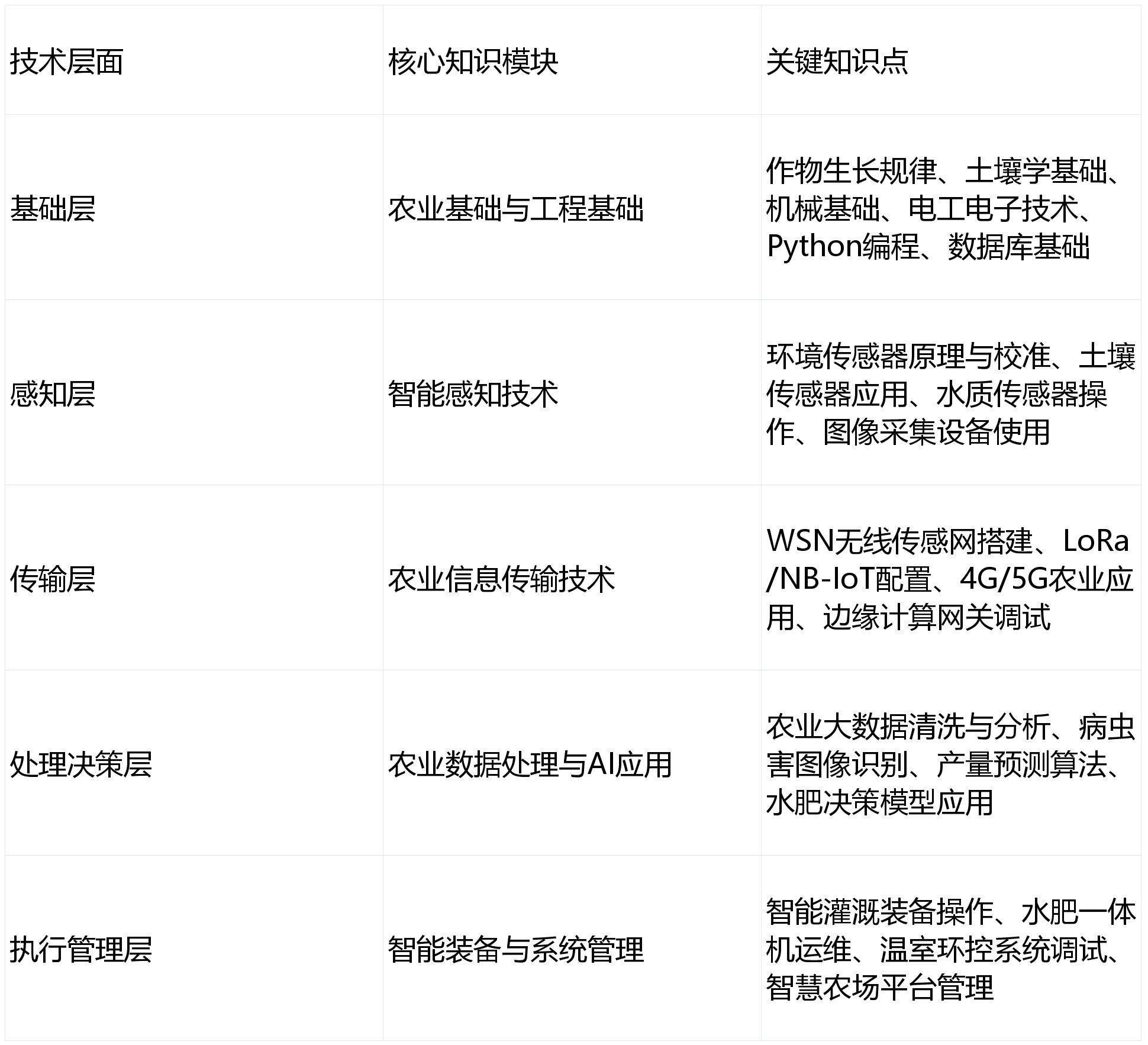 结合智慧农业"感知-传输-处理-执行-管理"全链条技术特性与高职人才培养目标,构建"基础层-感知层-传输层-处理决策层-执行管理层"的递进式知识体系,确保学生既掌握扎实的技术基础,又具备灵活的行业应用能力。