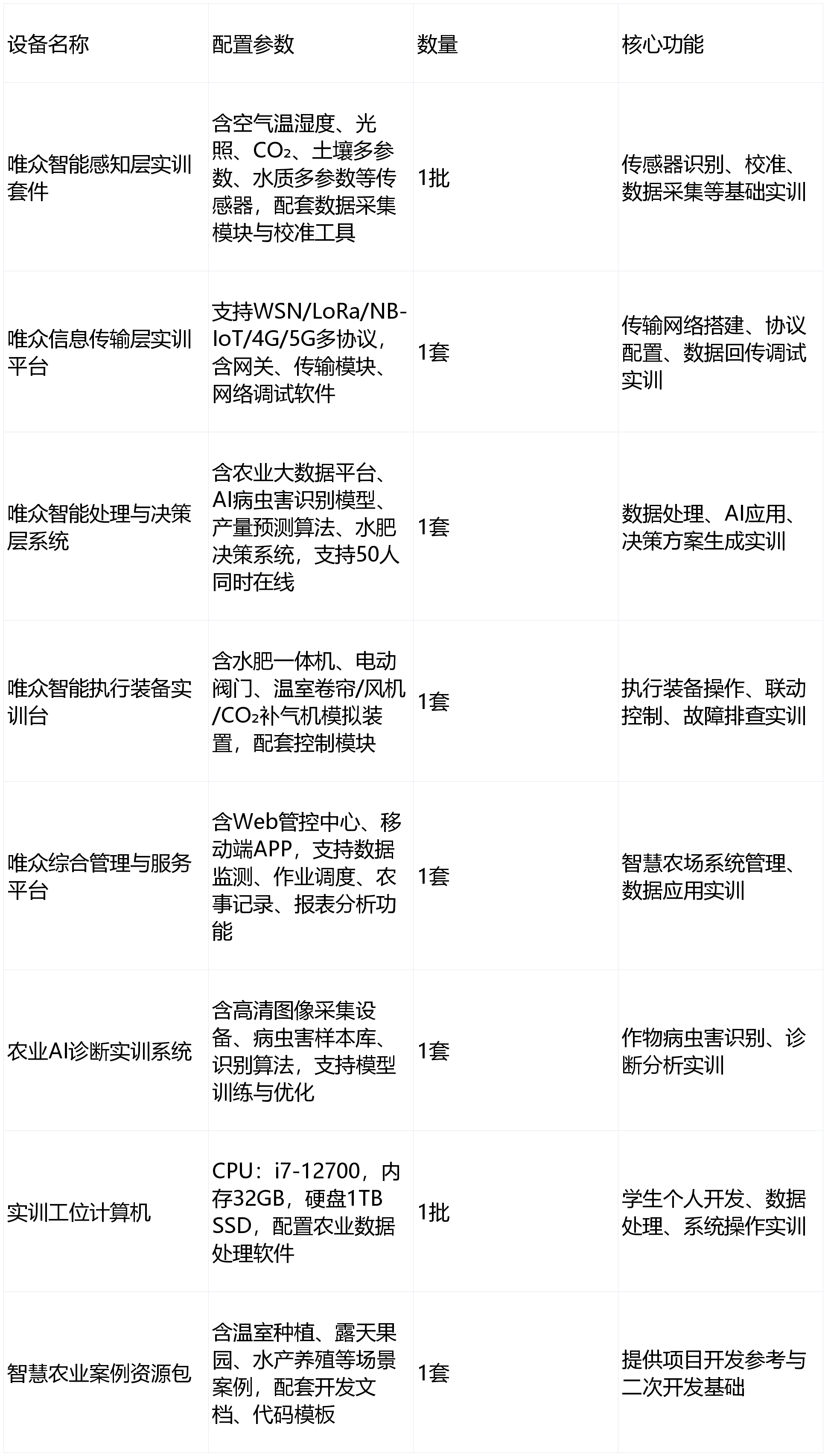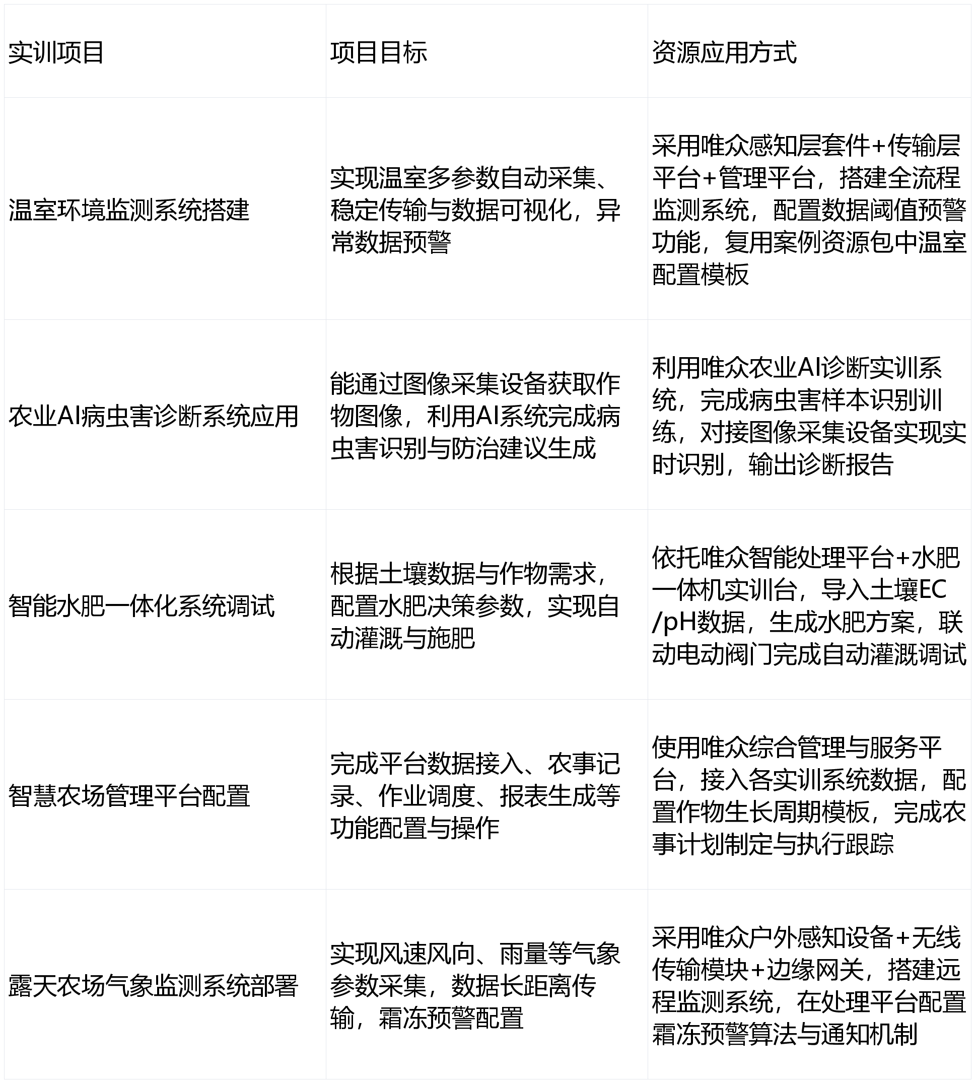 以唯众智慧农业"感知-传输-处理-执行-管理"全链条装备为核心,配套完善的软硬件资源,确保实训内容与产业技术同步。