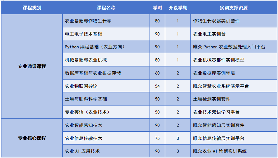 核心课程:农业智能感知技术、农业信息传输技术、Python农业数据分析、农业AI模型应用、农业大数据平台操作