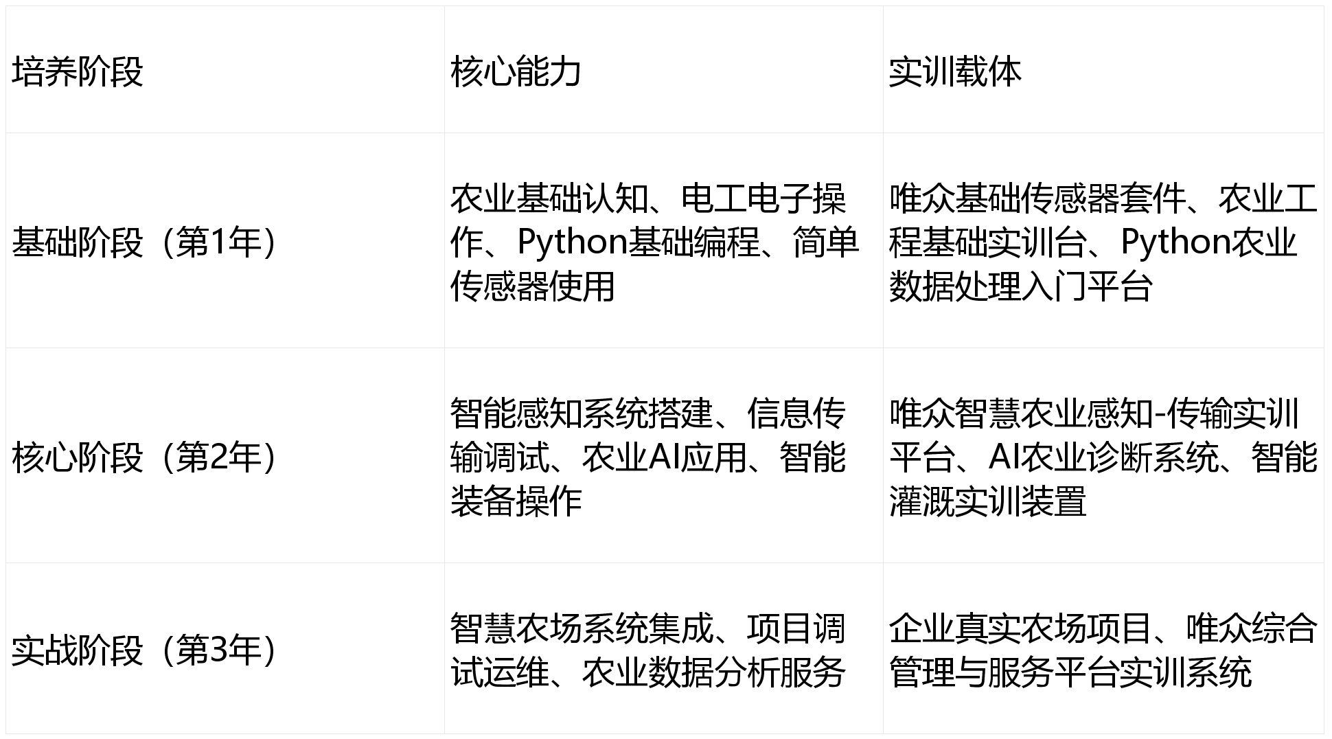 采用"三阶递进式"校企协同培养模式:第一阶段(第1-2学期)在校内依托唯众基础实训装备完成农业基础与技术基础学习;第二阶段(第3-4学期)通过唯众综合实训平台开展核心技能实训,掌握全链条技术应用;第三阶段(第5-6学期)进入合作企业参与真实项目,实现"学习-实训-就业"无缝衔接,打造"产学研创"一体化育人闭环。