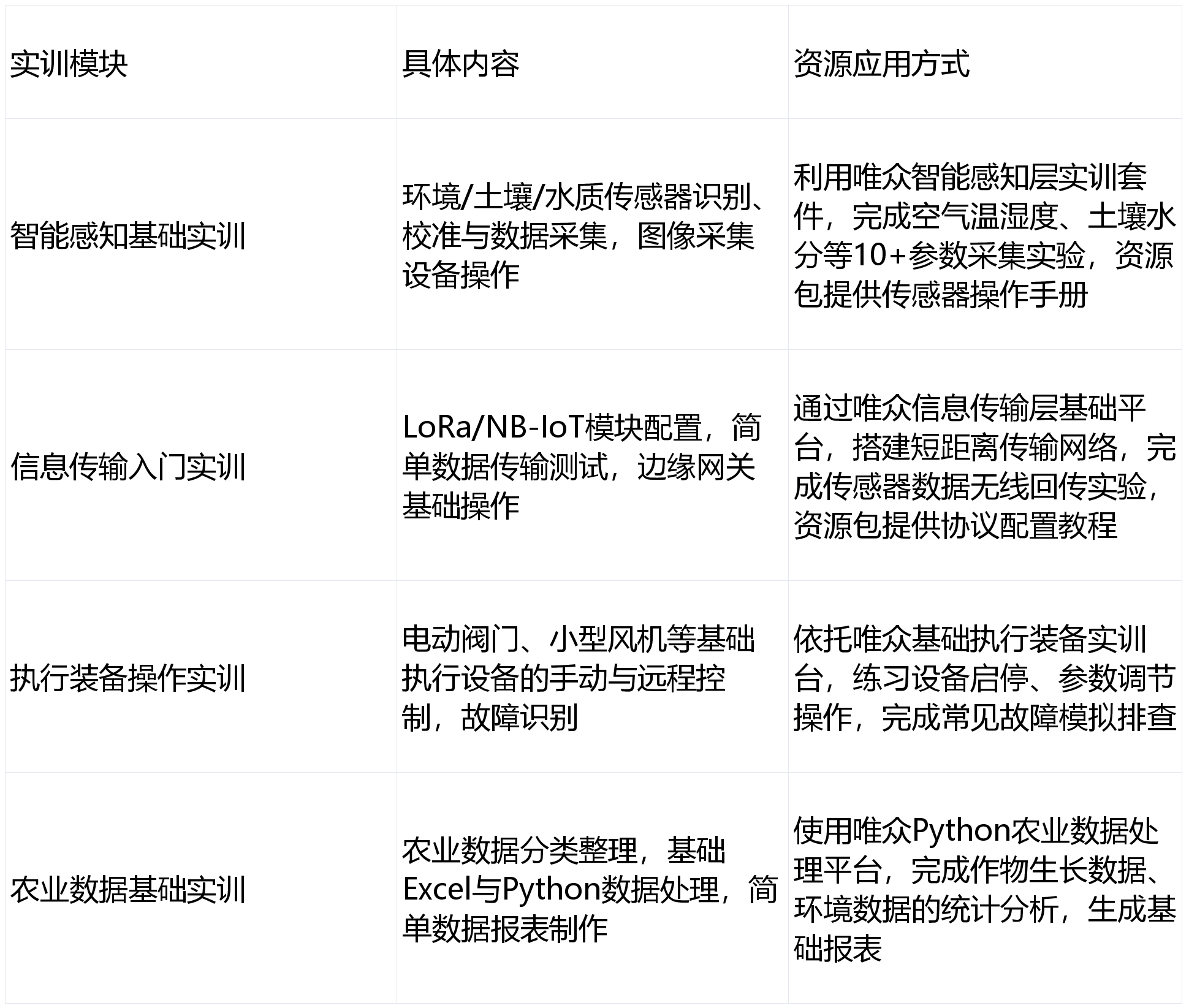 核心资源:唯众智能感知层实训套件、信息传输层基础平台、基础执行装备实训台、农业基础实训资源包