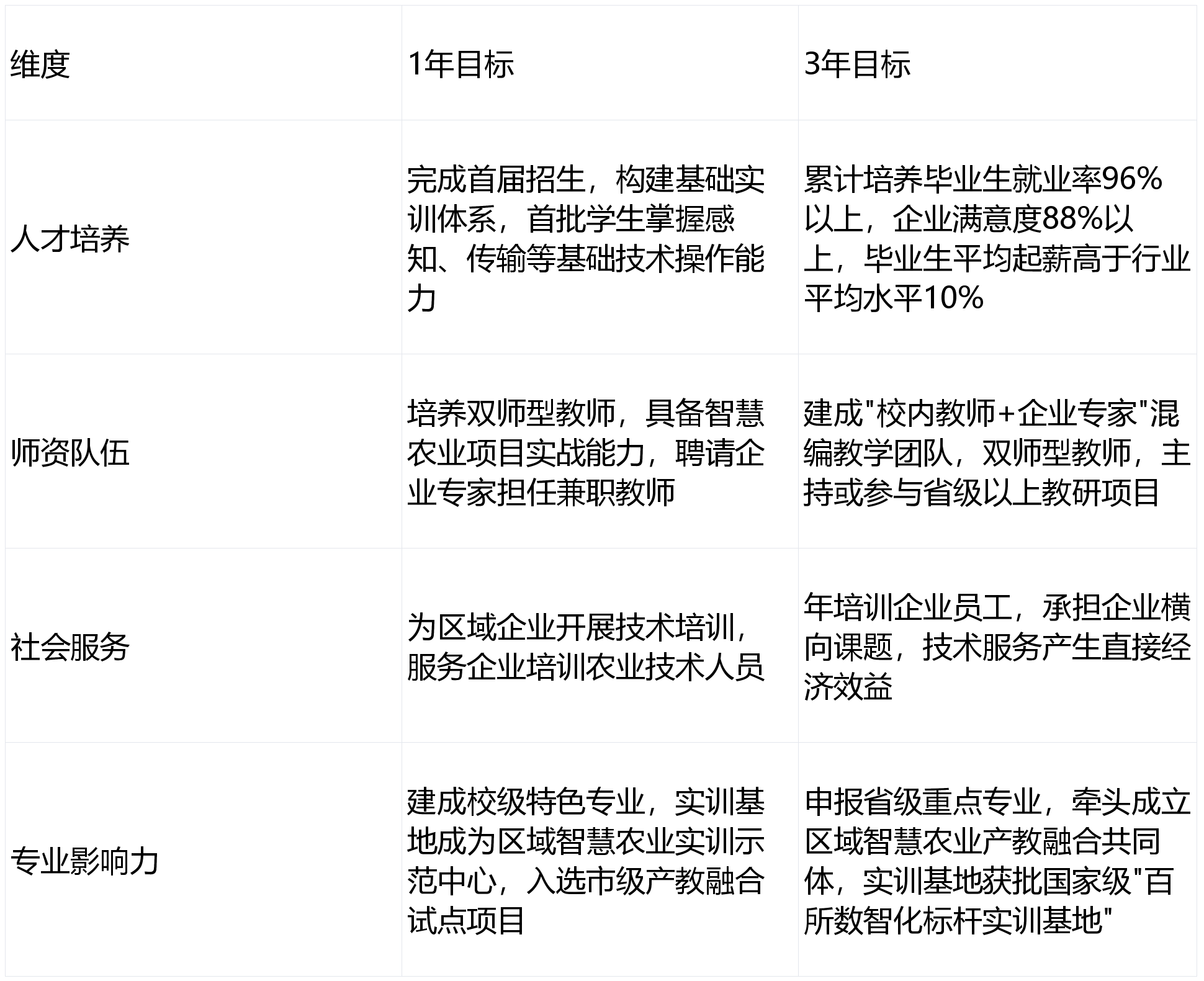 通过本方案实施,实现人才培养、师资队伍、社会服务、专业建设四大维度的显著提升,打造全国智慧农业技术与装备专业产教融合标杆。
