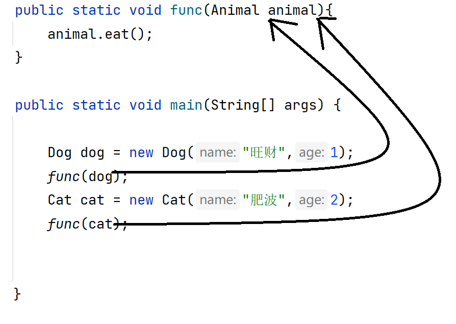此时就是将子类对象作为实参,父类引用变量作为形参,在方法传参的过程中进行了向上转型。