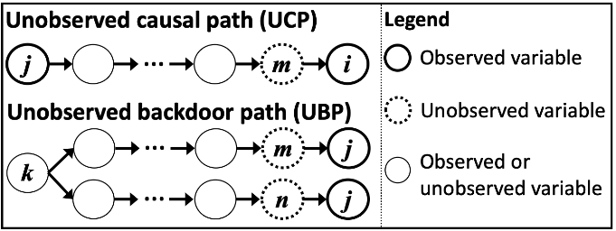 UCP 和 UBP 的定义:如图所示,从 xj 到 xi 的因果路径称为 UCP,如果该路径以连接 xi 及其未观测直接原因的有向边结束。如果一条后门路径从连接 xi 及其未观测直接原因的边开始,并以连接 xj 及其未观测直接原因的边结束,则该路径称为 UBP。