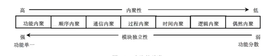 用于衡量模块内部元素结合紧密程度,理想模块只做一件事。类型有: