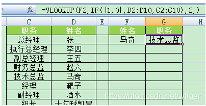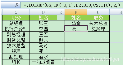 反过来,如果我们按照职务查找姓名,公式可以写成:=VLOOKUP(G3,IF({0,1},D2:D10,C2:C10),2,)。