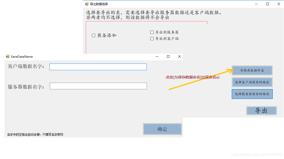 点击[导出数据]可以保存导出数据用于运行时读取数据,若是第一次导出数据还没有为导出数据命名则需要为导出数据命名,导出数据分为客户端数据与服务器数据,操作如下: