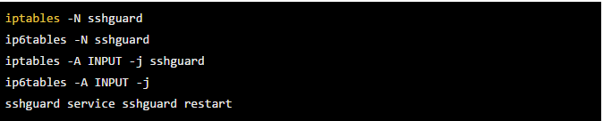 当sshguard阻止任何恶意用户(通过阻止其IP地址)时,它将使用sshguard链。准备好sshguard链并确保在检测到新的传入连接时也会触发链,最后重新启动sshguard。