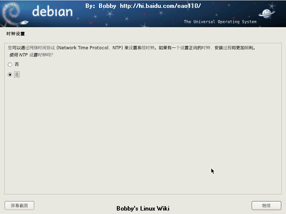 首先,安装程序会询问是否启用NTP对时,下图所示。NTP是一个网络时钟同步协议,它会利用网络上的时钟服务器对计算机进行精确的时钟调整,如果你的网络连接正常,并且可以访问到NTP服务器的话,不妨启用NTP;但是,如果你需要通过代理服务器才能上网,并且局域网内部也没有NTP服务器的话,这项功能就没什么意义,可以选否。