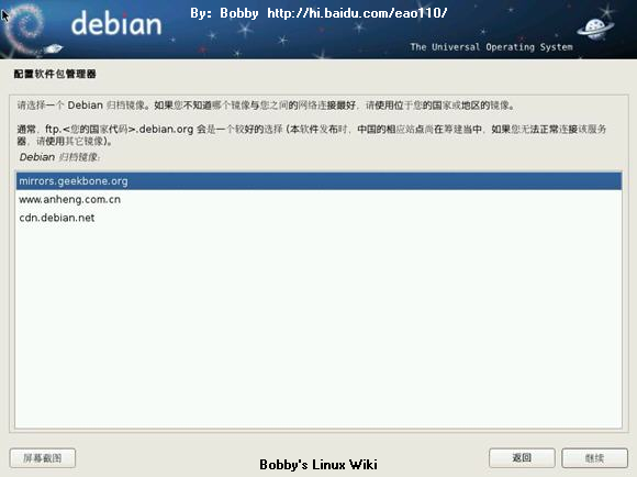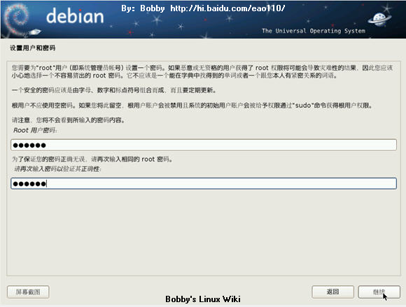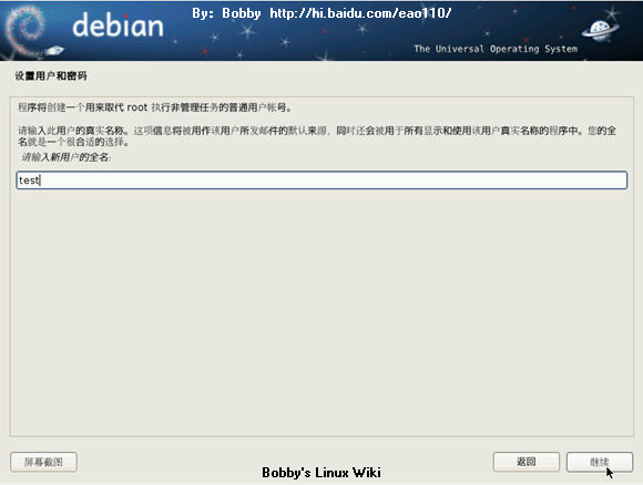 配置网络连接之后,要为自己的计算机选定一个主机名和域名,主机名是计算机的名字,而域名是计算机所在的组织的名字,两者组合起来就是计算机的完整域名。对于家庭用户,可能并没有注册过自己的域名,这个位置可以空着,或自己取一个喜欢的。而主机名就是计算机自己的标识,不可以留空,对于企业网中,主机名常常就是使用者的名字或是服务器的用途,如ftp.debian.org,不过,家庭中我们倒是可以起得随意一些。