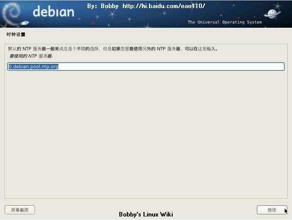 一旦你选择了打开NTP对时功能,安装程序接下来就会让你指定时间服务器的域名,如下图所示。对于一些组织,比如中国教育和科研计算机网(CERNET)内部有多个时间服务器,这里,指定一个离自己最近的服务器即可,否则使用默认的服务器。