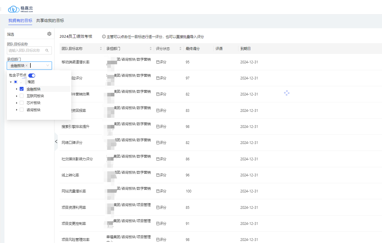 稳赢云绩效管理功能支持按岗位性质指定目标管理方案,业务部门、职能部门根据部门特点设置工作关键指标,有效衔接了各部门绩效与公司总体战略目标之间的关系。同时,将关键绩效指标分解为工作计划/任务,再责任到人。助力企业上下一心,共同推动企业发展,促进企业整体绩效的完成。