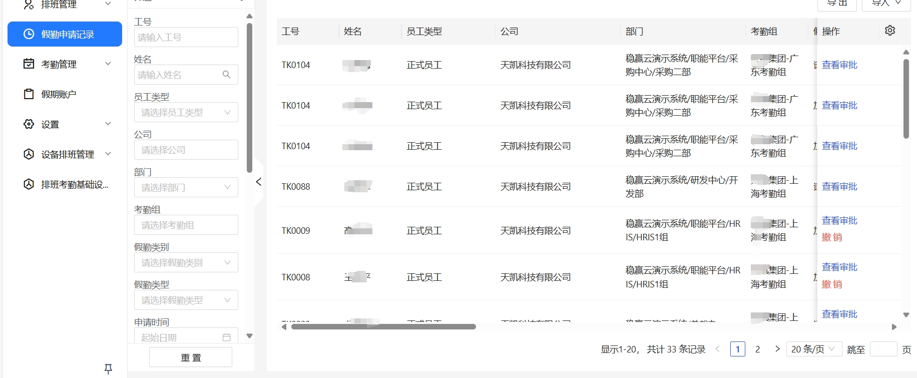 针对企业不同员工的考勤需求,系统支持自定义设置考勤方案,覆盖考勤、加班、请休假、异常处理考勤等假勤全场景,同时,又能够与钉钉、企微考勤机形成数据联动,有效降低数据统计、集成等繁琐工作。此外,系统还支持自动统计员工出勤情况,并生成报表(日报/月报),自定义筛选条件+一键导出出勤报表,避免人工繁琐操作,真正帮助HR/管理层实现快速查看和高效管理。