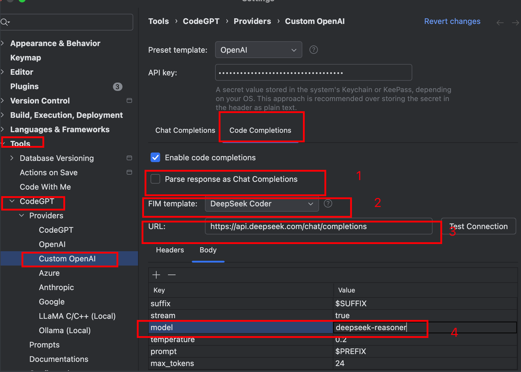 Body 中model 参数设置为: deepseek-reasoner