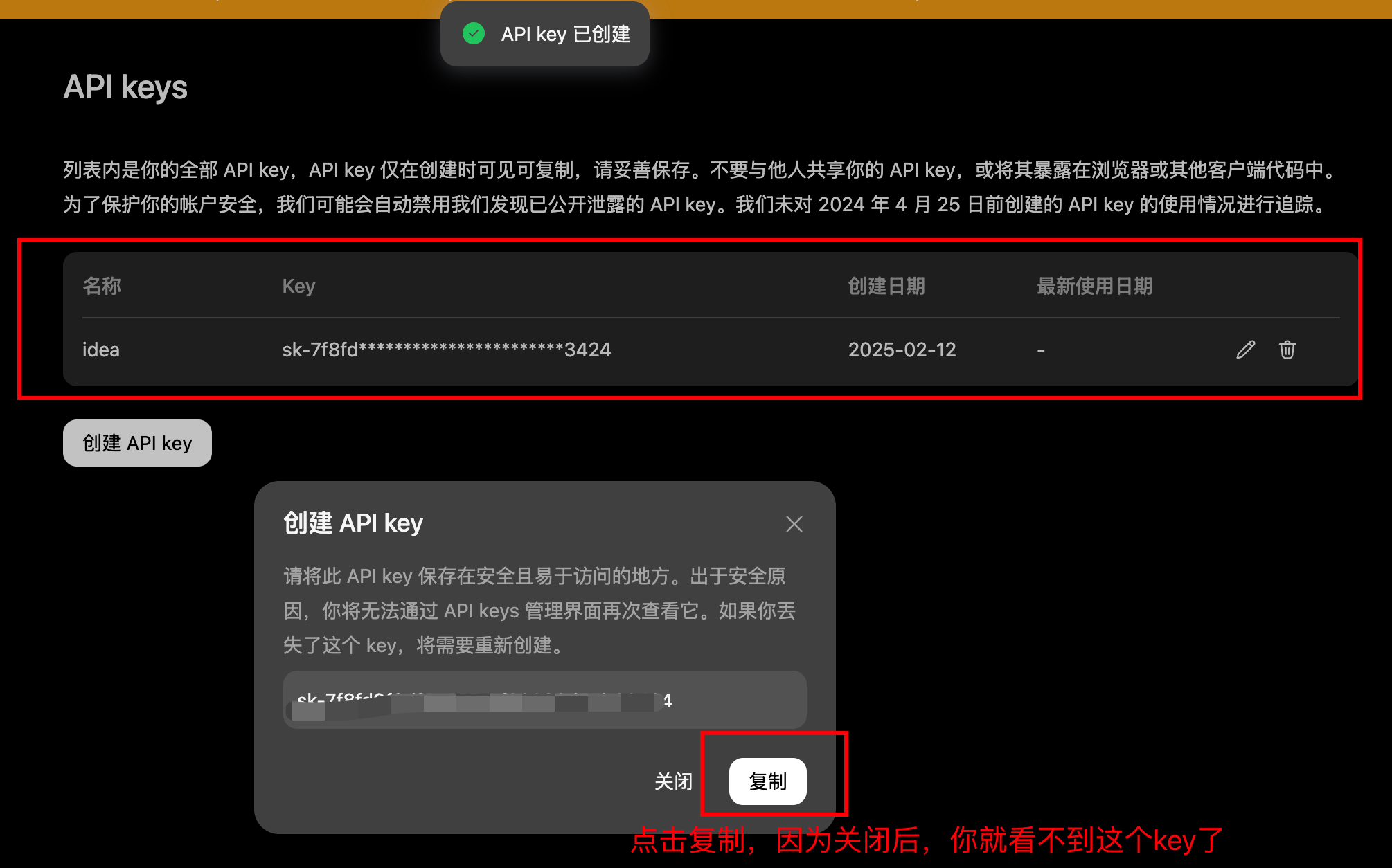 3.7 点击复制,把key ,保存到其他地方。
