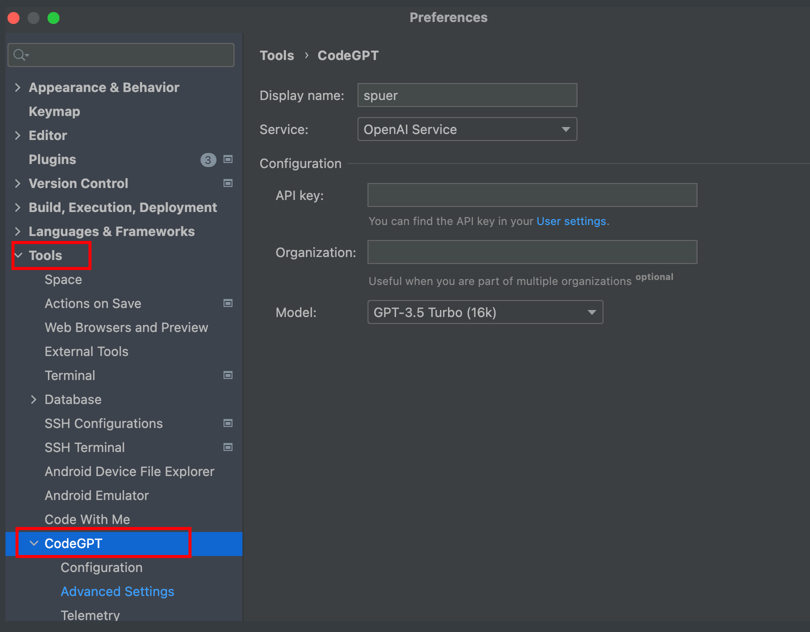 4.2 点击Tools,显示出: CodeGPT 的配置页面。