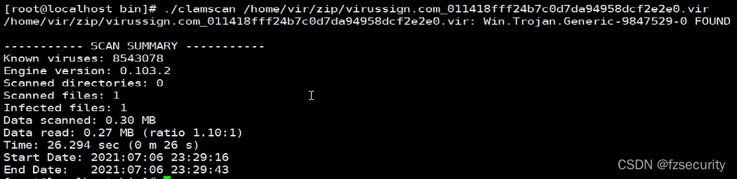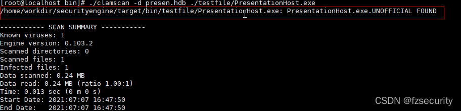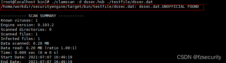 该函数需要注意的一点是,virname在函数中指向了engine结构的表示目标扫描文件名称的内存,不能被直接释放。最后一个参数传入CL_SCAN_STDOPT,默认配置即可。