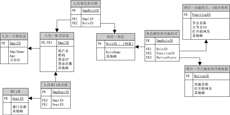 我设计了下面的这几个表,来解决这些问题。这里我只想表示表之间的关联,至于字段我只是写了几个主要的,字段的设计嘛,大家肯定各有各的方式,我想我写出来主要的就可以了。