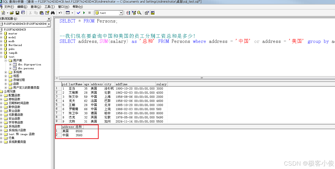 SELECT address,SUM(salary) as '总和' FROM Persons where address = '中国' or address = '美国' group by address;