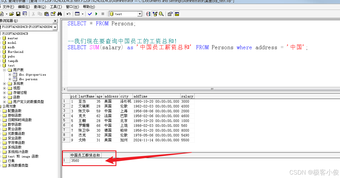 比如: 我们现在要查询中国员工的工资总和!