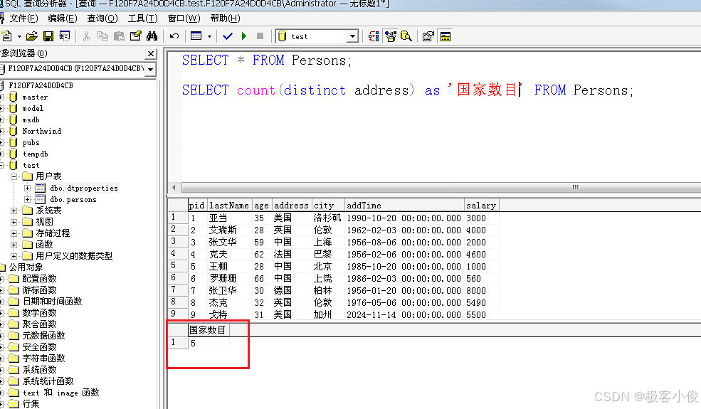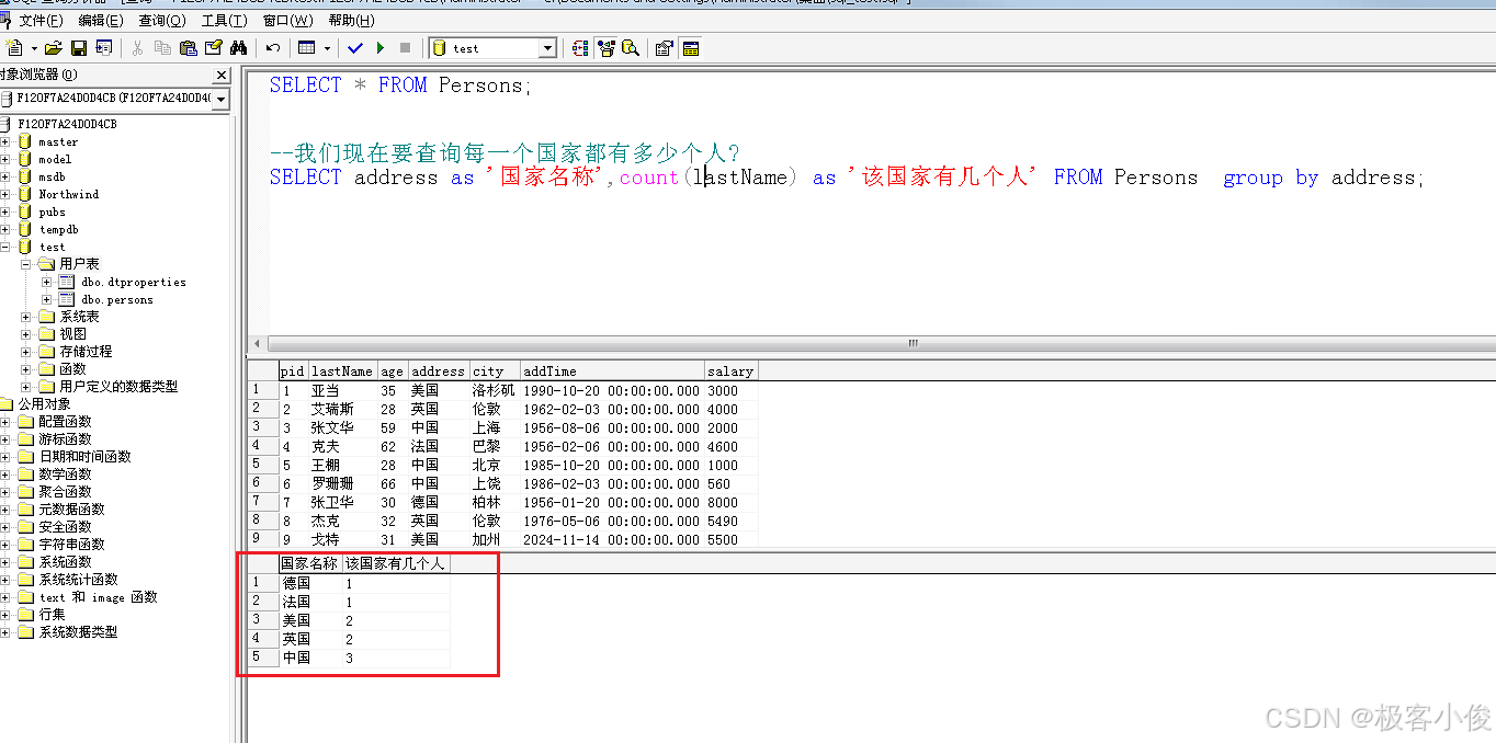 比如: 我们现在要查询每一个国家都有多少个人?