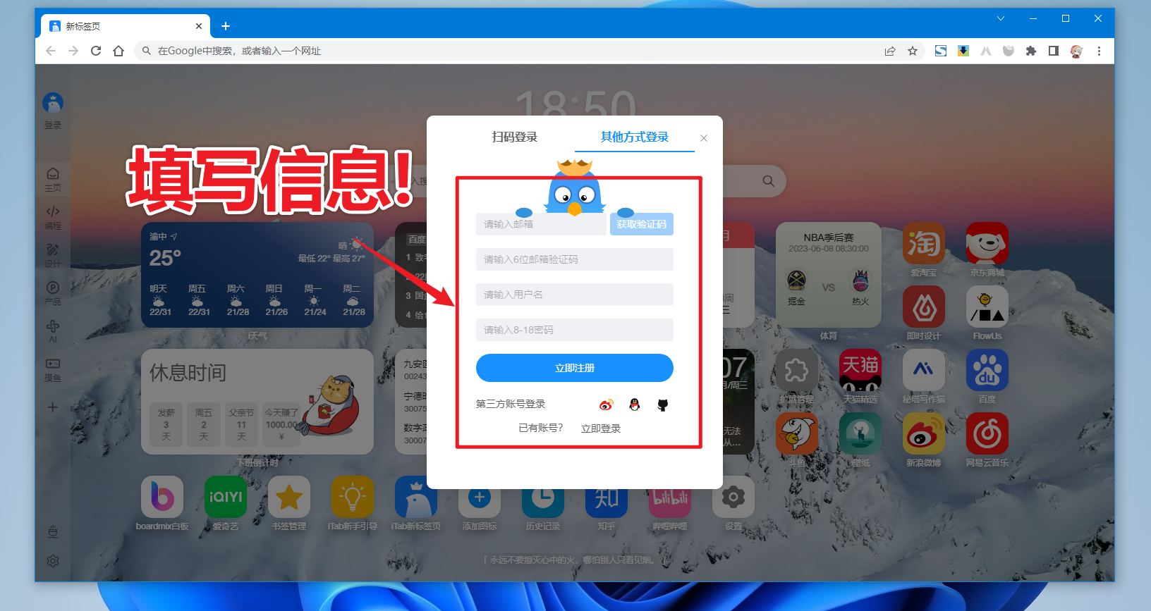 为了更好的使用iTab插件 我个人建议注册一账号, 这样我们可以实现数据云同步,方便管理!