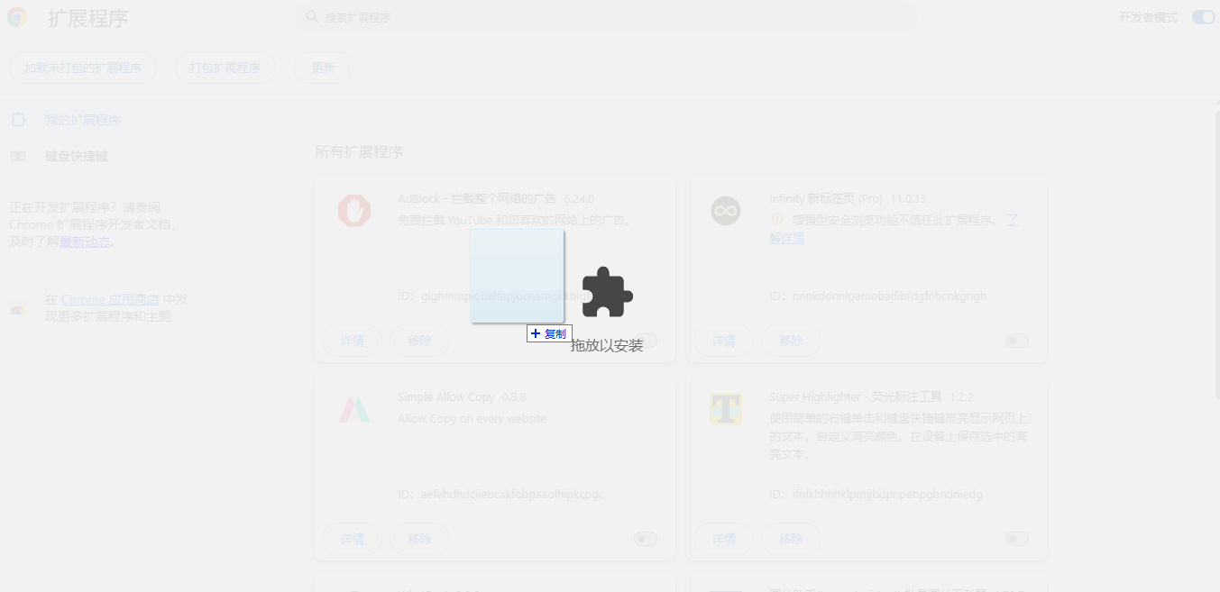 将解压后的文件夹中的WeTab.crx文件拖拽到扩展管理页面上,松开鼠标左键~