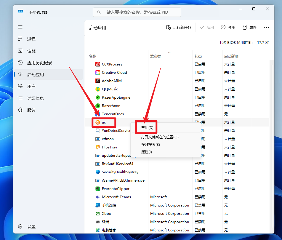 找到UC或ubrowser.exe,右键选择禁用 就可以了~