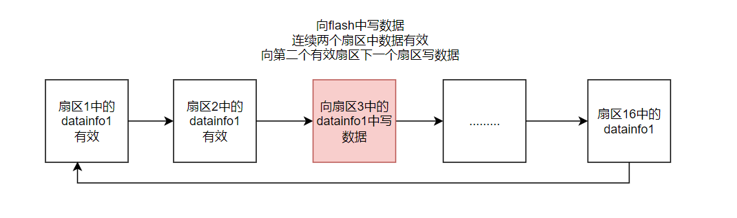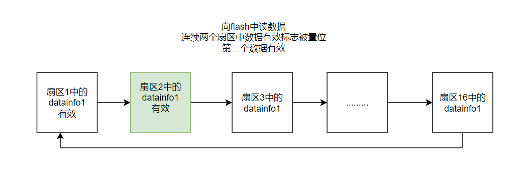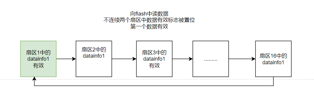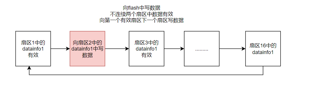 当向主区写数据时,例如写index为1的数据,主区16个扇区中的datainfo1初始化为一个环形链表,首先会轮训链表中的datainfo1有效标志是否置位,datainfo1有效标志均未被置位,那就向环形链表的头结点也就是扇区1的datainfo1中记录数据。若下次想更改datainfo1里面的内容时,就向这个扇区的下一个扇区的datainfo1中写入当前数据,写完后把上一个扇区中的有效标志清零。
