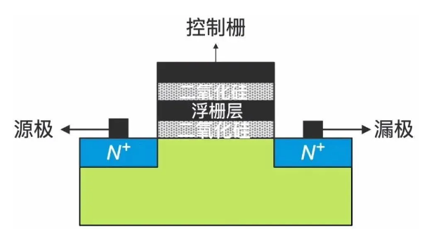如果浮栅存储了电⼦,当在控制栅极施加正电压时,浮栅电⼦与衬底有⼀个负电场,会削弱导通电压,这样晶体管导通需要在控制栅极上放置更高的电压。如果浮栅没有电⼦,MOS管控制栅电压没有被削弱,导通电压正常。