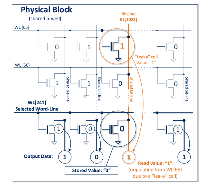 擦除阶段将所有bit擦到基准范围时,由于一些特殊原因,导致电压值低于这个基准范围,在后续的回编过程中,由于这些bit电压过低,会出现这些bit大部分都无法校准到1的电平范围,这将会导致同group的其他bit叠加一个过擦的漏电流,如果该电流大于1的读出判据,则该地址数据会被误判为1,引起邻区的bit由0到1的翻转。如下图所示: