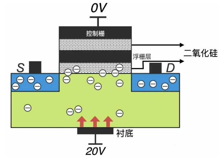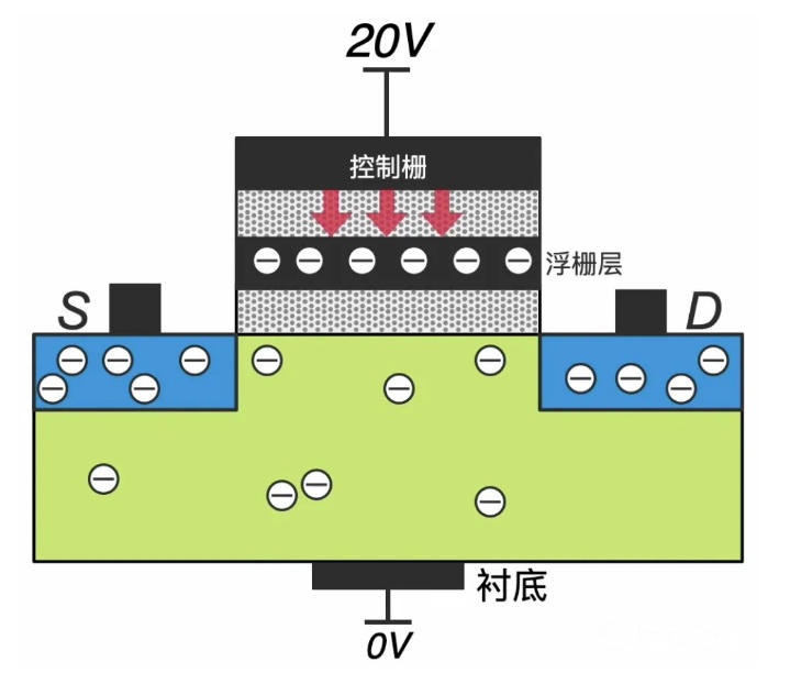 在写入电子时,在控制栅极施加相对于衬底的高压时,离子阱的电子被吸引并隧穿进入浮栅层被存储在其中,如果撤销电压之后,因为浮栅层被绝缘层包裹,浮栅层电子还是存储在这个部位,此状态计为逻辑0。