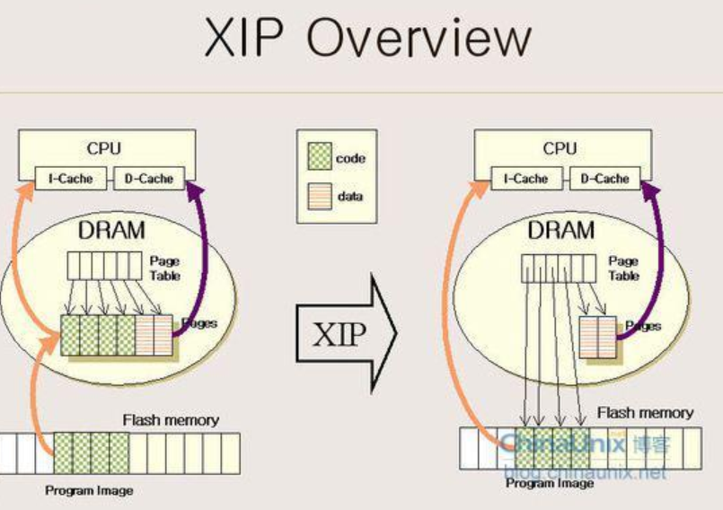 左边是非XIP方式代码执行流程,可以理解成是 Nand Flash,CPU 想要从 Nand Flash 中读取数据,必须要先通过在 RAM 中计算地址,各种时序计算,然后通过 MMU 转换地址,然后给 Nand flash 发送命令,注意是命令,不是地址, Nand Flash根据命令进行相应的操作,如果是读命令,则返回对应地址的数据到 RAM 中,如果是写命令,则进行写操作。