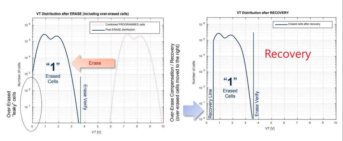 norflash的擦除操作是Erase和Recovery两个动作的循环,回编是为了保证擦除动作完成后没有过擦。通过每个bit物理点的充放电标记0和1,相对高电平阈值范围对应0,低电平阈值范围对应1,当擦除flash时,会先将所有的bit放电到一个低电压的基准值,随后通过回编将所有bit基本都重新拉到1的区域内,这样就实现了擦成全FF如下图所示: