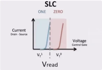 假如在浮栅层上没有电子时,控制栅极施加电压 Vt1 时导通,在浮栅层放置电子后,控制栅极施加电压Vt0导通,满足Vt0 > Vt1。为了读出cell的值,在控制栅极施加一个电压V(Vread),要求Vt1 < V <Vt0。如果晶体管导通,源极和漏极间能读到电流,浮栅层上肯定没有电子,即逻辑 1 。如果晶体管不导通,源极和漏极间不能读到电流,浮栅层上肯定放置有电子,即逻辑 0 。
