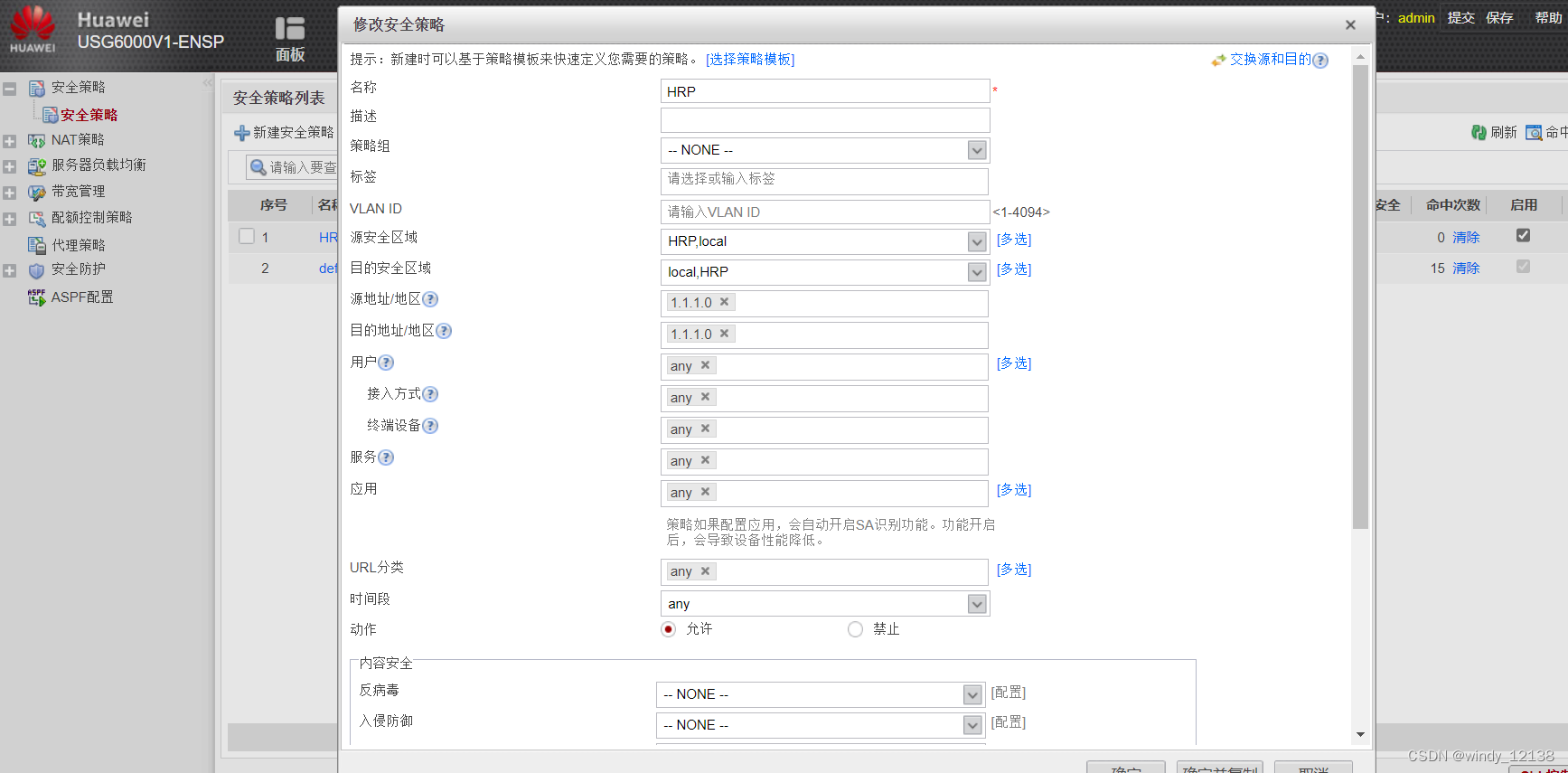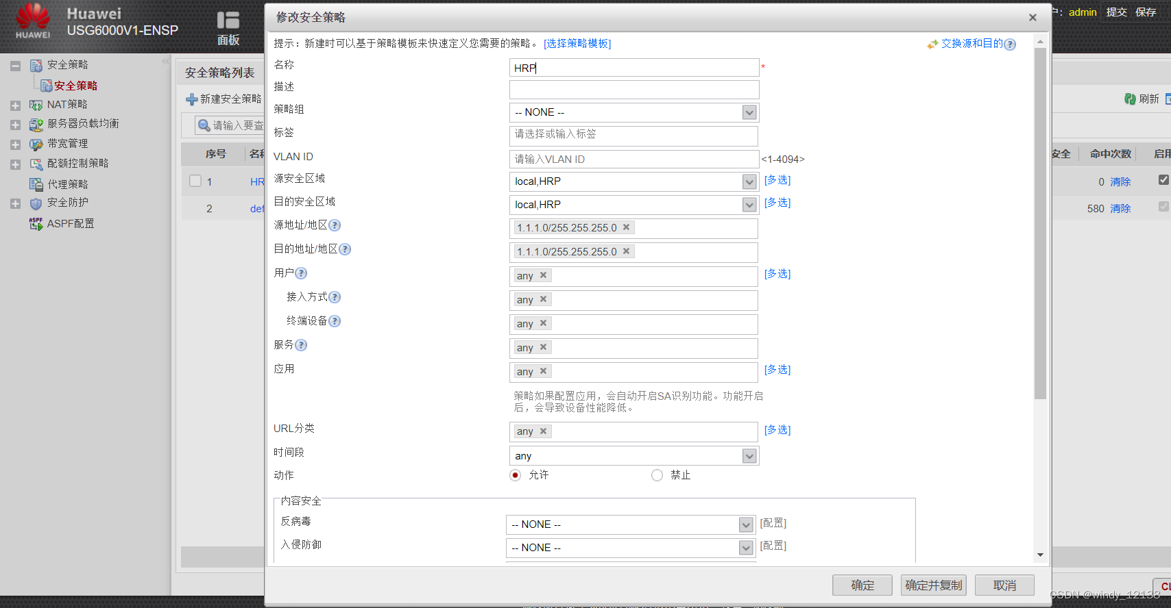 再做一个HRP策略:(其中发现没有HRP协议可选,我们就用any代替,但是实际操作中必然选HRP协议)
