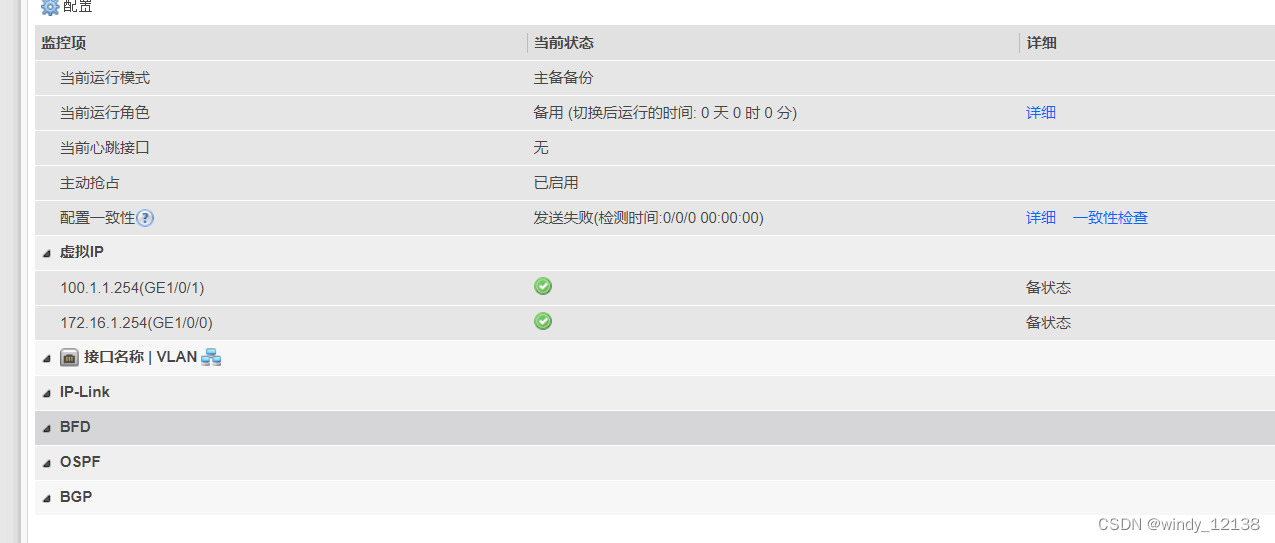 当三种可能就是链路可能断开的情况,当主防火墙的物理链路以外断掉,vrrp协议将流量切换到下方的备份防火墙的链路上去,如果在断开之前,主防火墙发送的首包,那么断开之后,对端回包的时应该是走备用的防火墙的线路。 如果两个防火墙的会话表没有同步,vrrp也没有进行同步,流量还是会走主防火墙,即使物理链路断掉。这样的结果就是终端收不到回包。所以:当一个防火墙的物理链路断掉,那么在它与备份防火墙中的vrrp必须要进行同步状态才能接过 主防火墙未完成的使命。