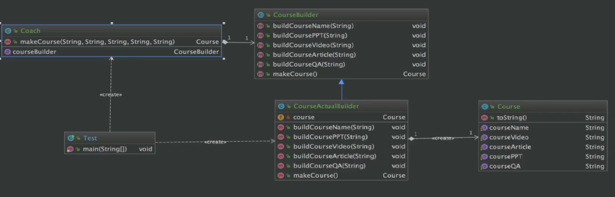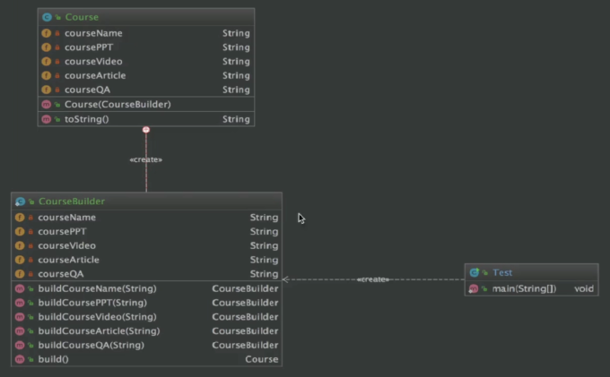 Course course = new Course.CourseBuilder().buildCourseName("Java设计模式精讲").buildCoursePPT("Java设计模式精讲PPT").buildCourseVideo("Java设计模式精讲视频").build();
