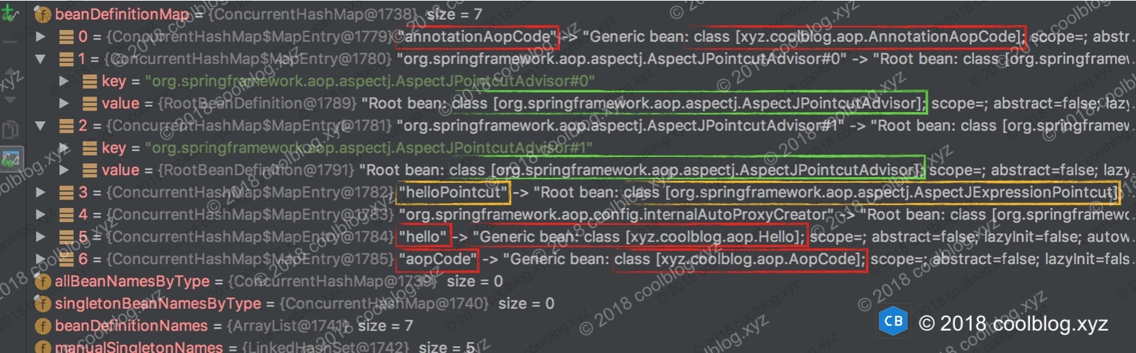 如上图所示,红框中对应的是普通的 bean 定义,比如 <bean id="hello" .../>、<bean id="annotationAopCode" .../>、<bean id="appCode" .../> 等配置。黄色框中的则是切点的定义,类型为 AspectJExpressionPointcut,对应 <aop:pointcut id="helloPointcut" .../> 配置。那绿色框中的结果对应的是什么配置呢?目前仅剩下两个配置没说,所以对应 <aop:before .../> 和 <aop:after .../> 配置,类型为 AspectJPointcutAdvisor。这里请大家注意,由 @Aspect 注解修饰的 AnnotationAopCode 也是普通类型的 bean,该 bean 会在查找通知器的过程中被解析,并被构建为一个或多个 Advisor。