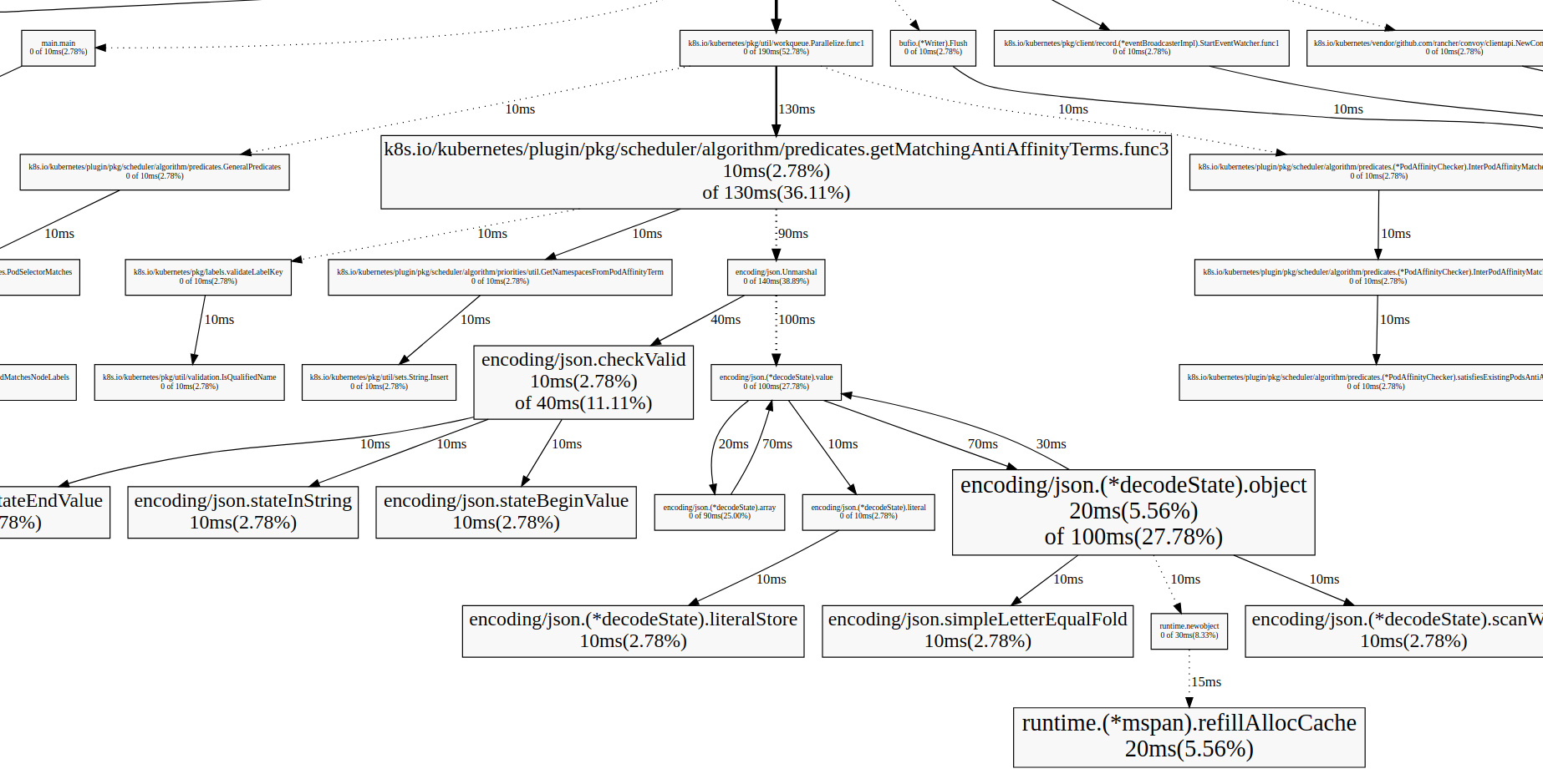 20ms 5.56% 5.56% 100ms 27.78% encoding/json.(*decodeState).object