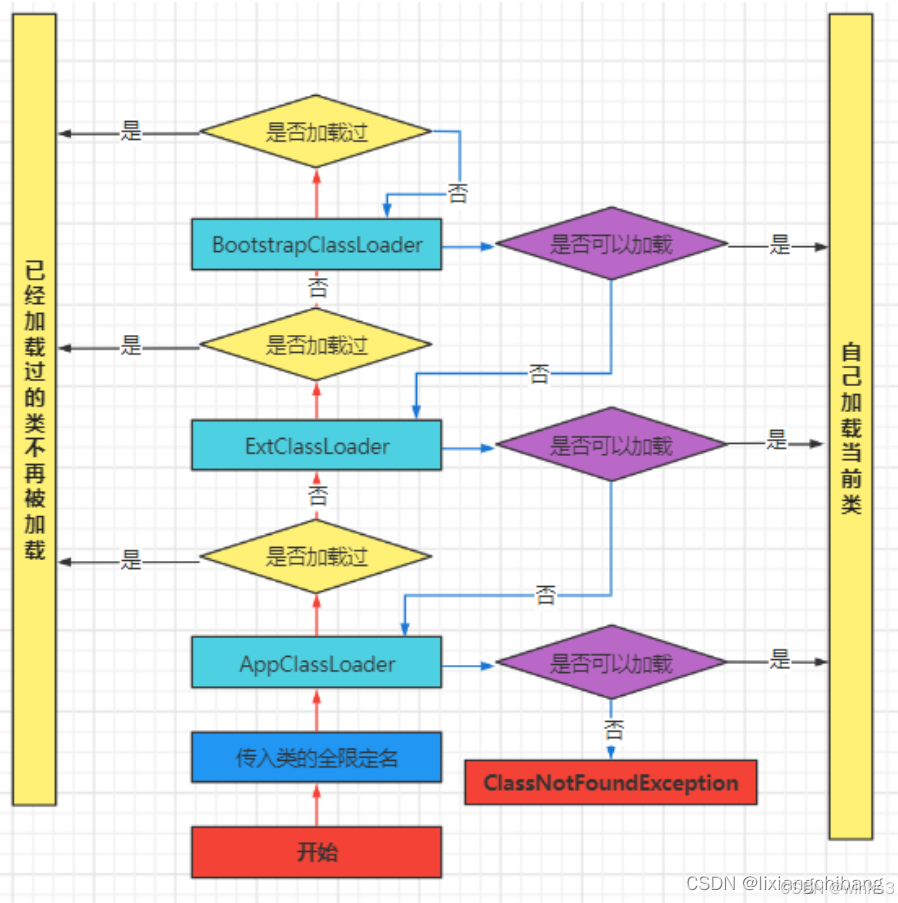类加载器采用了双亲委派模型(Parent Delegation Model)来加载类。每个类加载器在尝试加载类之前,会先委托其父类加载器进行加载。只有当父类加载器无法加载该类时,当前类加载器才会尝试自己加载。这种机制确保了类的加载过程是有序的,并且可以避免类的重复加载,同时也保证了类的唯一性和安全性。