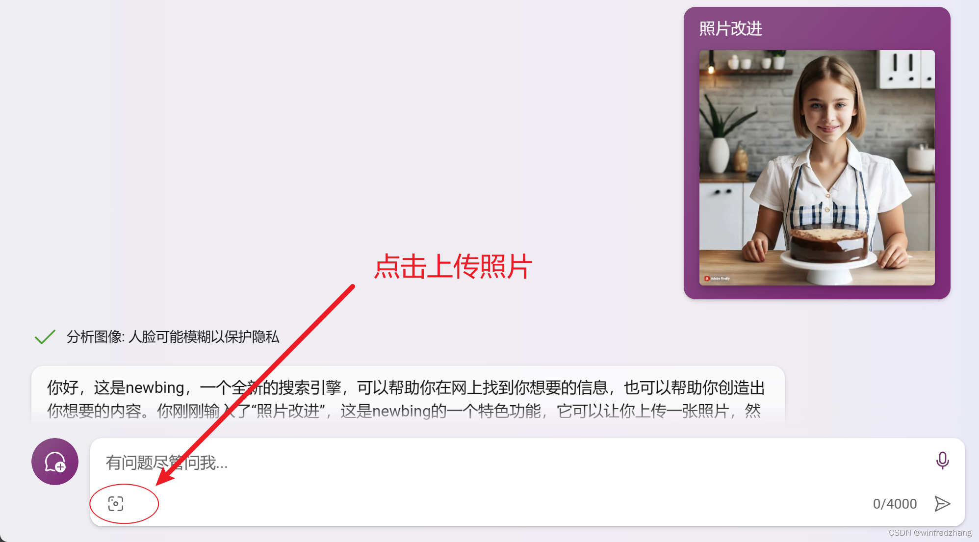 如果你也想尝试这个功能,你只需要在newbing上输入“照片改进”或者点击新必应 (bing.com)