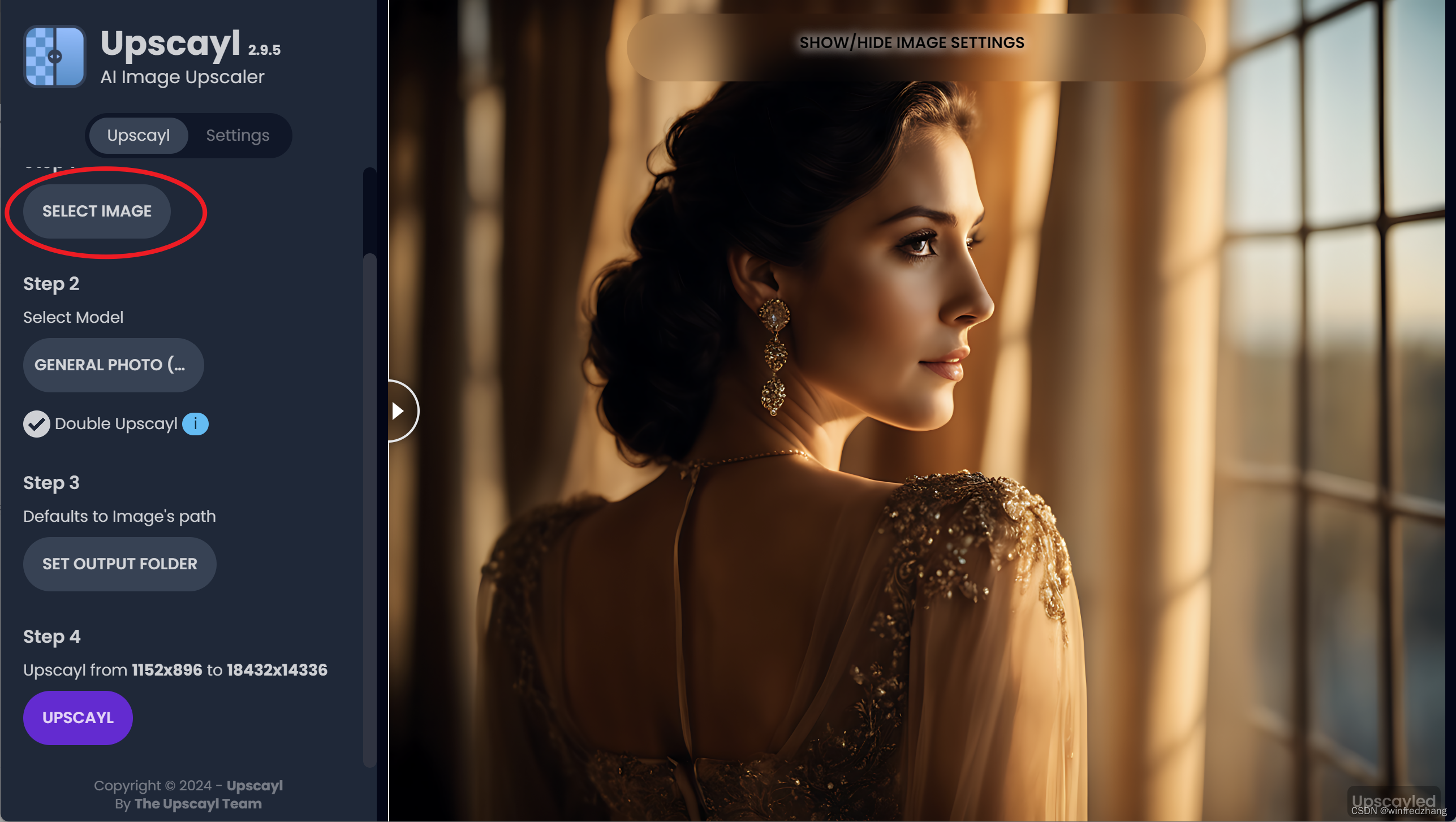 - 在 Upscayl 网站或移动应用程序中,单击 select image按钮。您需要上传要放大的图片。您可以上传 JPEG、PNG 或 TIFF 格式的图像。