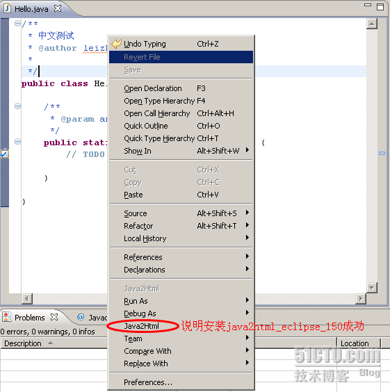 新建一个Java project,然后新建一个类,在类代码上点击右键如图,如果看到java2html菜单项,则说明安装成功。