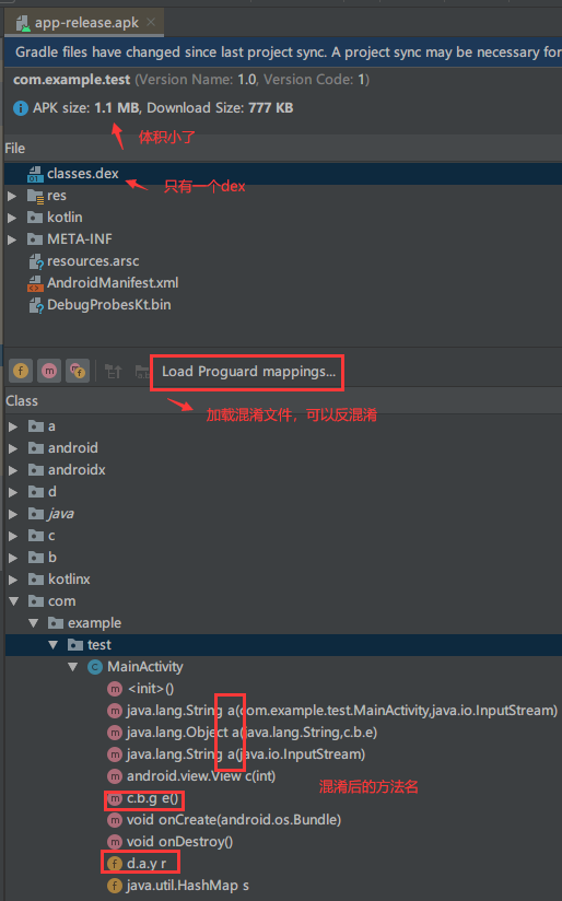 体积着实少了一些,而且变量名都变成了abcd,顺带提下这个**Load Proguard mappings**,点击加载混淆文件(mapping.txt)后可以去掉代码混淆: