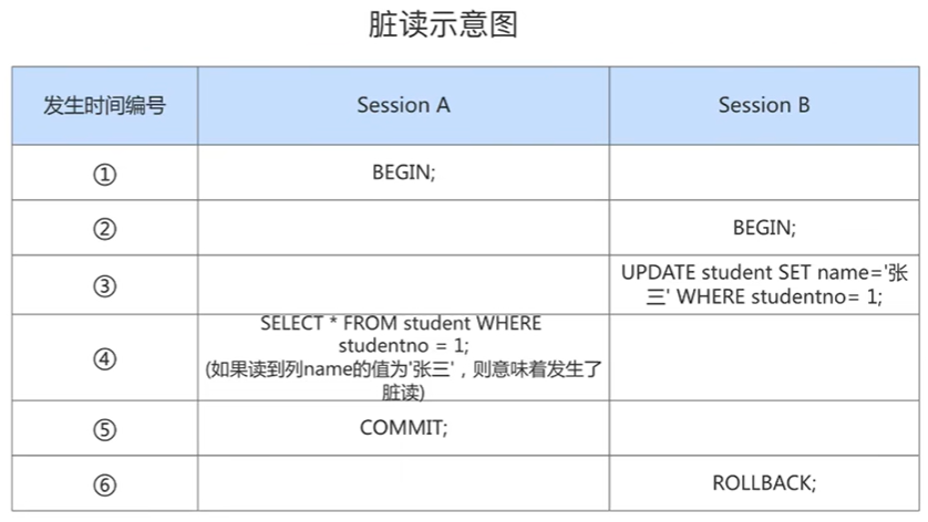 Session A 和Session B 各开启了一个事务,Session B 中的事务先将 studentno 列为 1 的记录的 name 列更新 为'张三',然后 Session A 中的事务再去查询这条 studentno 为1的记录,如果读到列 name 的值为'张三',而 Session B 中的事务稍后进行了回滚,那么 Session A 中的事务相当于读到了一个不存在的数据,这种现象就称之为脏读 。