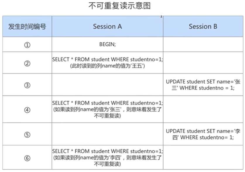 对于两个事务 Session A、Session B,Session A 读取了一个字段,然后 Session B 更新了该字段。 之后Session A 再次读取同一个字段, 值就不同了。那就意味着发生了不可重复读。