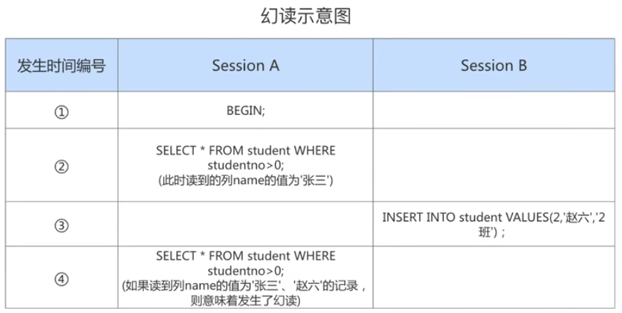 Session A中的事务先根据条件 studentno > 0 这个条件查询表 student,得到了 name 列值为'张三'的记录;之后 Session B 中提交了一个隐式事务 ,该事务向表student中插入了一条新记录;之后Session A中的事务再根据相同的条件 studentno > 0 查询表student,得到的结果集中包含 Session B 中的事务新插入的那条记录,这种现象也被称之为幻读 。我们把新插入的那些记录称之为幻影记录 。